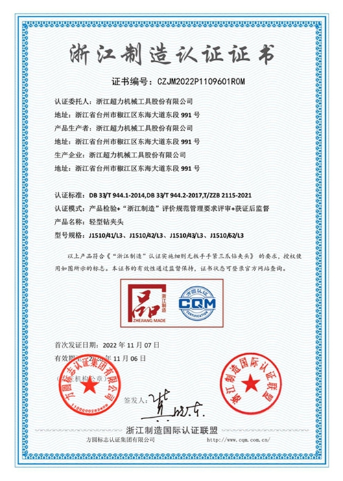 2022年10月10日,在經(jīng)過嚴格的產(chǎn)品檢驗、第三方審查等環(huán)節(jié),我公司正式獲得《浙江制造認證證書》,此證書是由浙江制造國際認證聯(lián)盟和方圓標志認證集團有限公司(CQM)聯(lián)合簽發(fā),這也意味著我們制造的輕型鉆夾頭成功通過了浙江制造業(yè)含金量最高的標準認證,獲得了“品字標”。