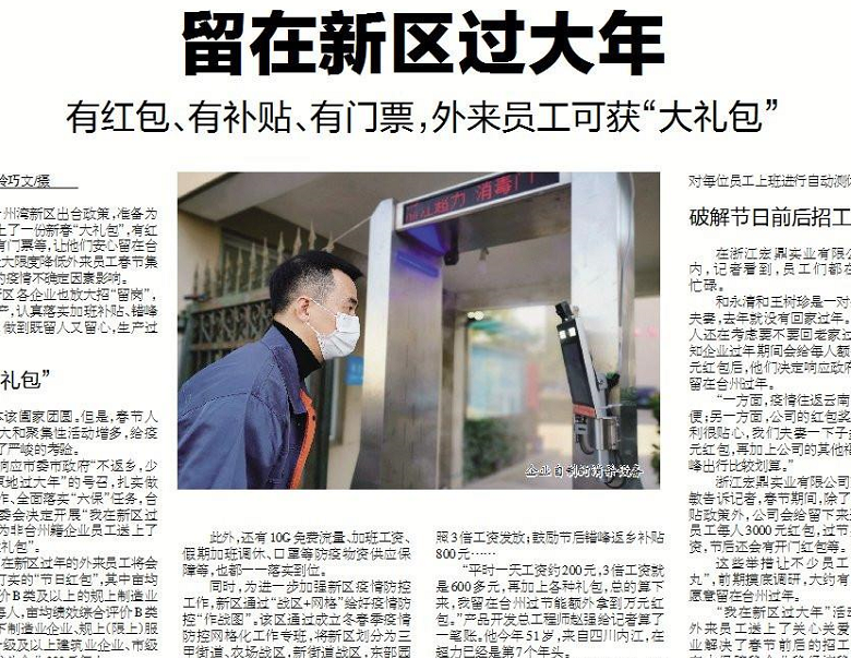 公司“不計成本,放大招”留住外來員工就地過大年這一倡議之舉,紛紛贏得臺州各家新聞媒體先后報道,為疫情防控和經濟發(fā)展做出應有貢獻。